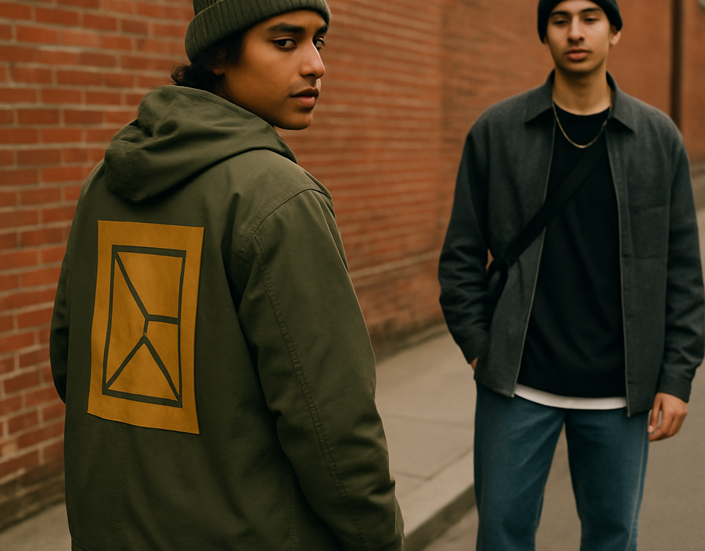 Ein Print kann entweder die Akzentfarbe liefern oder eine harmonische Verbindung zwischen den Schichten schaffen. SuperCal Decals bietet farblich abgestimmte Prints, die du gezielt als wiederkehrendes Element einsetzt — auf Hoodie, Ärmel oder Rückseite der Jacke. Kombiniere zum Beispiel ein olivgrünes Parka mit einem senfgelben Motiv für eine warme Herbstpalette.
